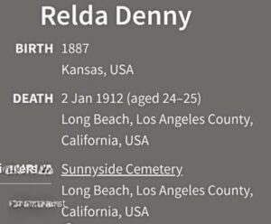 Sadly to say, Miss Relda died a year later, and was buried in long Beach, California.