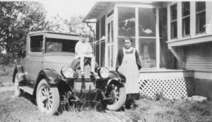 Mildred Wikkerink (my mother) and Great Aunt Bertha Patterson on grandpa’s Whippet car in Willard, Ks., 1929.